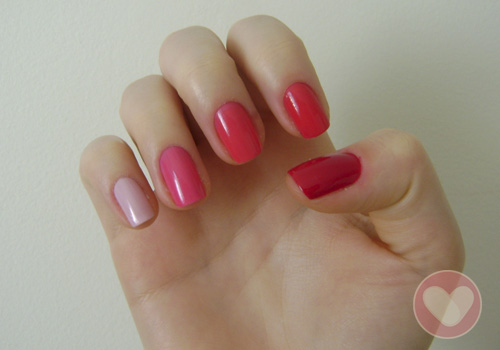 As unhas ombré também criam o efeito degradê nas unhas, só que de uma forma mais divertida. Para fazer as unhas ombré, basta formar uma escala de cores a partir do tom mais claro até o mais escuro nas unhas. A escolha dos esmaltes fica por sua conta, só é preciso que as nuances combinem entre si. Vale misturar vidrinhos de esmaltes com cores mais antigas, até as mais recentes e de marcas diferentes, todas com efeito opaco ou com o brilho do glitter. Faça da maneira que preferir.