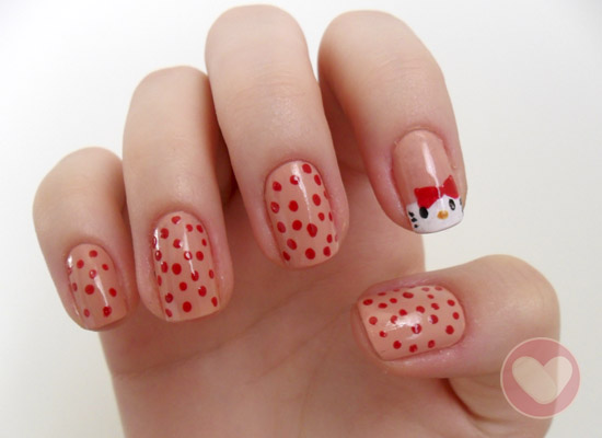 Agora com o pincel fino, faça os bigodinhos nos dois cantos da unha. Use novamente o pincel boleador para fazer o lacinho da Hello Kitty.